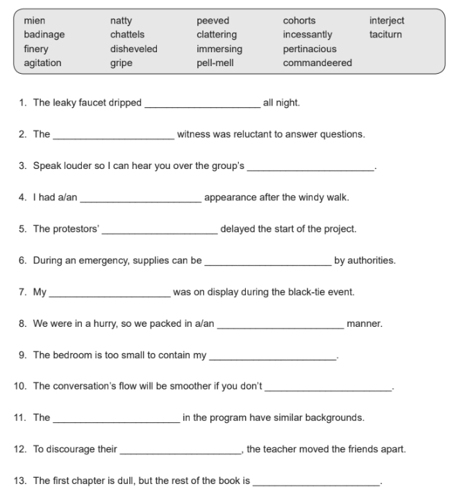 On the second page for each case, you’ll find a fill in the blank activity. For this page, the vocabulary words are reviewed by placing each in a sentence. Some sentences offer two options and leave the final decision up to your child. The activity is helpful for reviewing the definition, synonyms, and antonyms for each week’s list. These two exercises offer an opportunity to practice assessing information, along with observation, evaluation, inductive thinking skills.