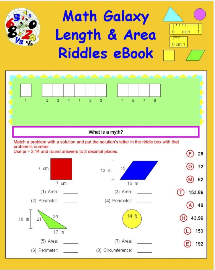 Decimals, Proportions, Percents Riddles EBook Bundle covers prealgebra topics like ratios, proportions, and includes word problems. Two of the books focus solely on practicing length, area, volume, capacity, weight, and angles. Algebra Riddles eBook Bundle provides over 200 worksheets over exponents, metric operations, and linear equations. This set of books is geared towards students in middle school and high school.
