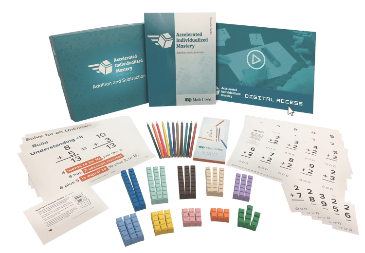 Since the beginning of my homeschool career, I’ve heard so many great things about Math-U-See and its products. So, imagine the actual “yippee” I let out when we received the opportunity to try their new Accelerated Individualized Mastery (AIM) for Addition and Subtraction. This AIM program features online lessons as well as the manipulatives this company is well known for. Let’s take a detailed look at everything we received.