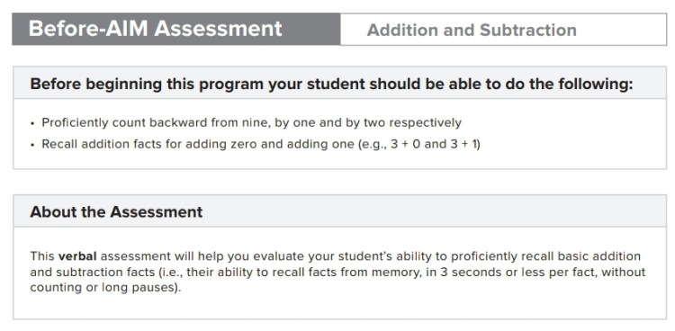 Prior to beginning the program, I had my son take the Before AIM Assessment, as suggested. This verbal assessment is used to evaluate your child’s addiction and subtraction proficiency. Based on his score, this program was a good fit to build his skills. We worked through this program daily as described in the resource book. I watched the corresponding AIM for Success video prior to teaching and made sure my teaching time was only 15 minutes. Some lessons were completed over a few days but as we progressed, we moved through them faster. When my son needed to go back over anything I made sure to do so to build his confidence.